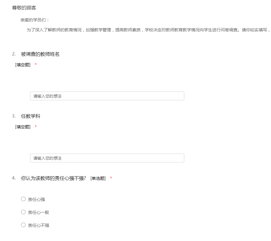 亲爱的学员们: 为了深入了解教师的教育情况,加强教学管理,提高教师素质,学校决定对教师教育教学情况向学生进行问卷调查。请你如实填写,谢谢你的合作!