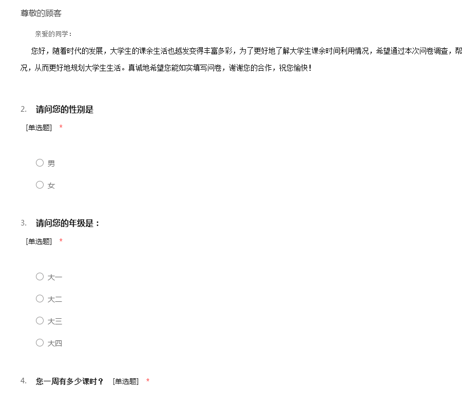亲爱的同学: 您好,随着时代的发展,大学生的课余生活也越发变得丰富多彩,为了更好地了解大学生课余时间利用情况,希望通过本次问卷调查,帮助大家更好地了解大学生课余时间利用情况,从而更好地规划大学生生活。真诚地希望您能如实填写问卷,谢谢您的合作,祝您愉快!