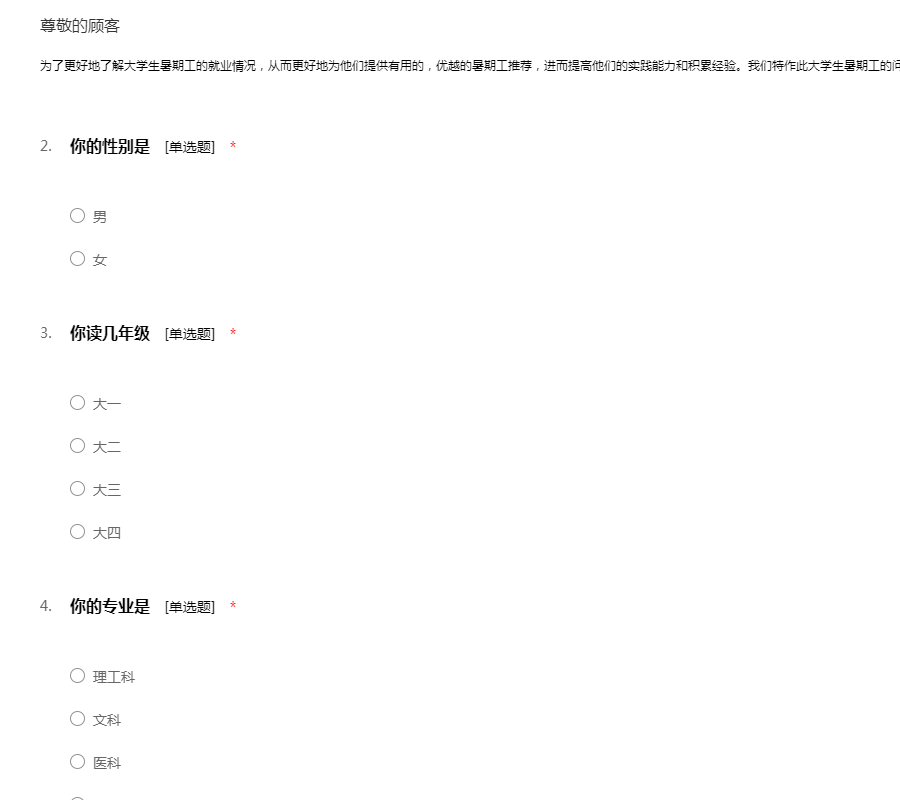 为了更好地了解大学生暑期工的就业情况,从而更好地为他们提供有用的,优越的暑期工推荐,进而提高他们的实践能力和积累经验。我们特作此大学生暑期工的问卷调查,请认真作出你的答案,谢谢!