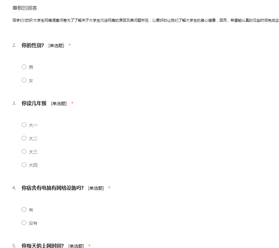 同学们!您好!大学生网瘾调查问卷为了了解关于大学生沉迷网瘾的原因及其问题所在,以更好的让我们了解大学生的身心健康,因而,希望能认真的花些时间完成这份大学生网瘾调查问卷!谢谢!