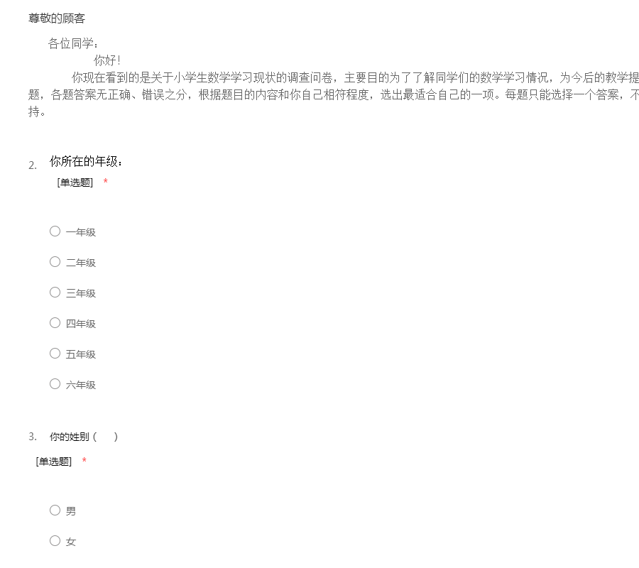 各位同学: 你好! 你现在看到的是关于小学生数学学习现状的调查问卷,主要目的为了了解同学们的数学学习情况,为今后的教学提供参考。请你仔细阅读下列每一道题,各题答案无正确、错误之分,根据题目的内容和你自己相符程度,选出最适合自己的一项。每题只能选择一个答案,不需要留下你的姓名,谢谢你的支持。