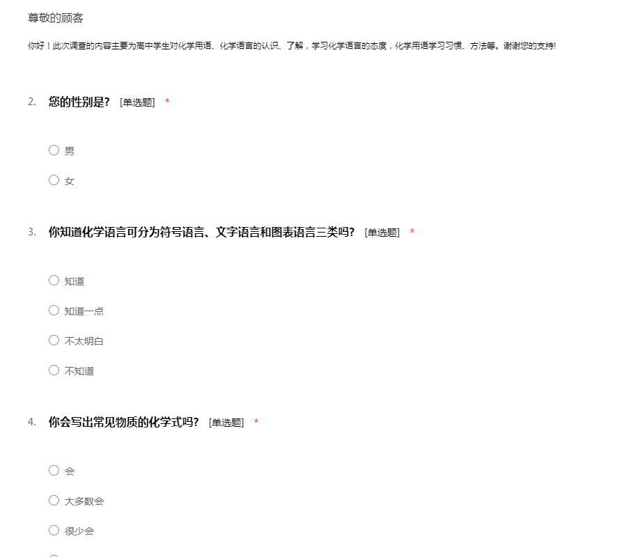 你好!此次调查的内容主要为高中学生对化学用语、化学语言的认识、了解,学习化学语言的态度,化学用语学习习惯、方法等。谢谢您的支持!