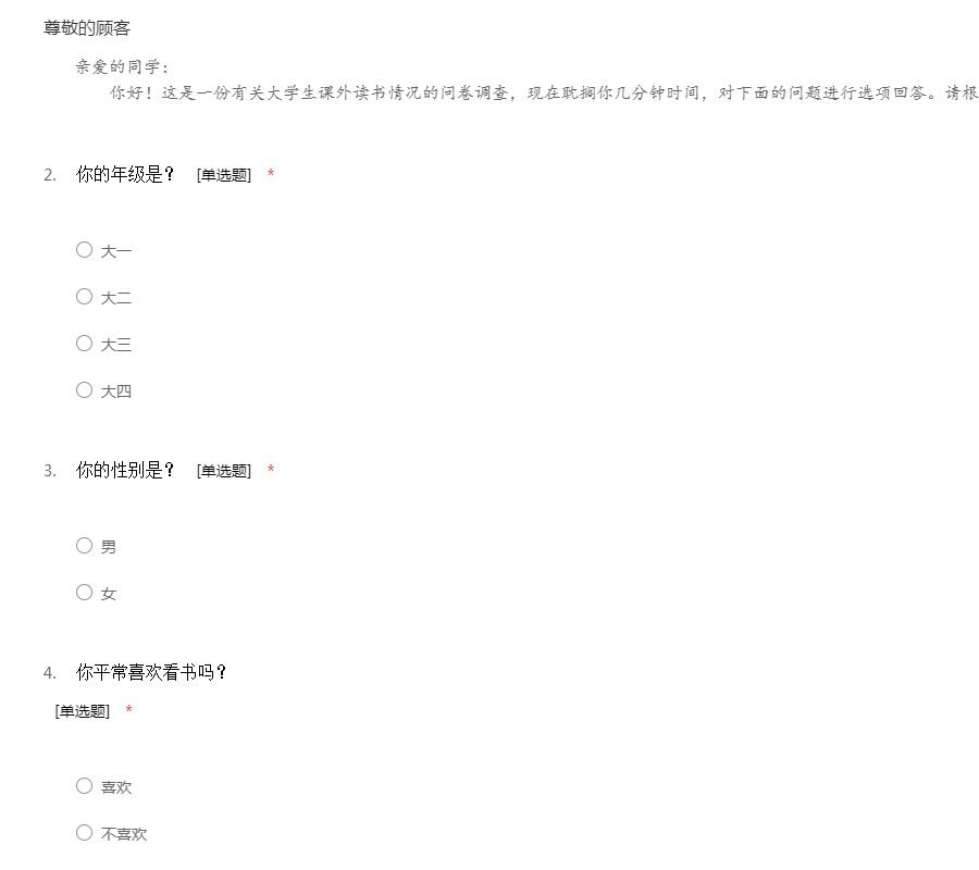 亲爱的同学: 你好!这是一份有关大学生课外读书情况的问卷调查,现在耽搁你几分钟时间,对下面的问题进行选项回答。请根据你自己的情况,如实填写。谢谢!