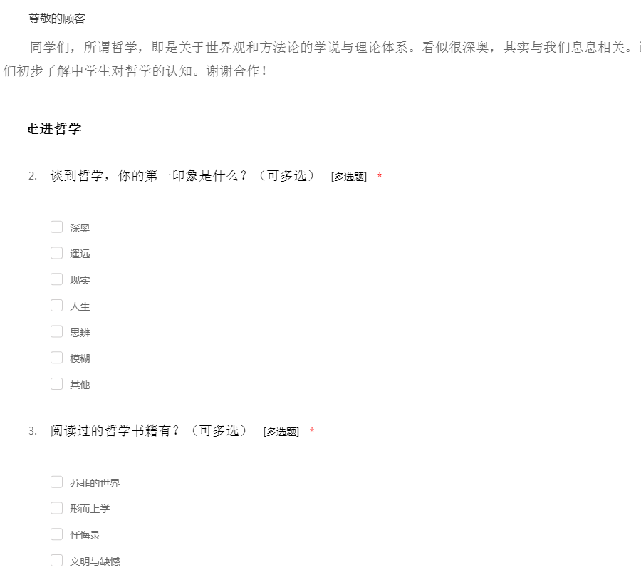 同学们,所谓哲学,即是关于世界观和方法论的学说与理论体系。看似很深奥,其实与我们息息相关。请你认真完成这份问卷,以让我们初步了解中学生对哲学的认知。谢谢合作!