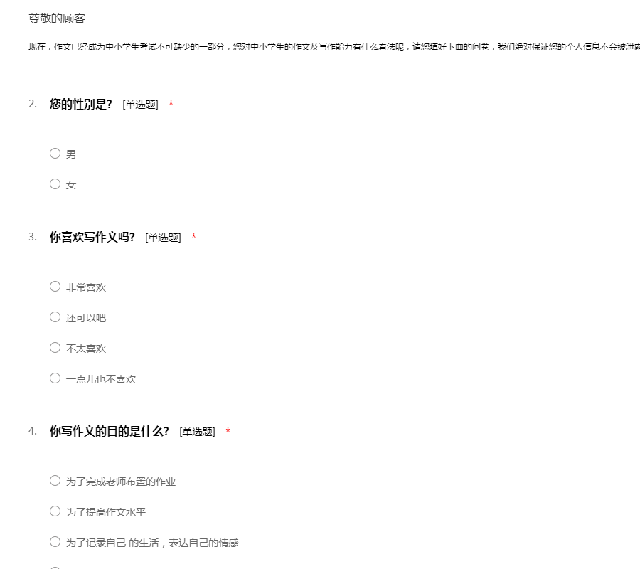 现在,作文已经成为中小学生考试不可缺少的一部分,您对中小学生的作文及写作能力有什么看法呢,请您填好下面的问卷,我们绝对保证您的个人信息不会被泄露。感谢您的参与!