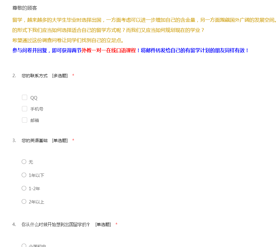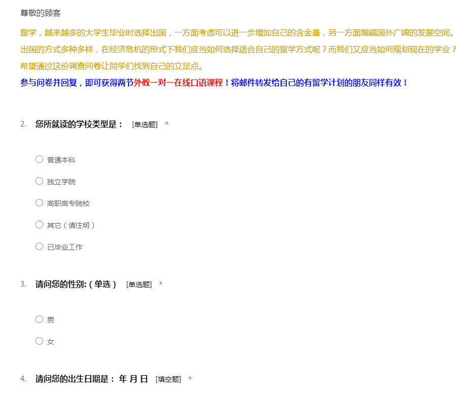 留学,越来越多的大学生毕业时选择出国,一方面考虑可以进一步增加自己的含金量,另一方面觊觎国外广阔的发展空间。出国的方式多种多样,在经济危机的形式下我们应当如何选择适合自己的留学方式呢?而我们又应当如何规划现在的学业? 希望通过这份调查问卷让同学们找到自己的立足点。 参与问卷并回复,即可获得两节外教一对一在线口语课程!将邮件转发给自己的有留学计划的朋友同样有效!