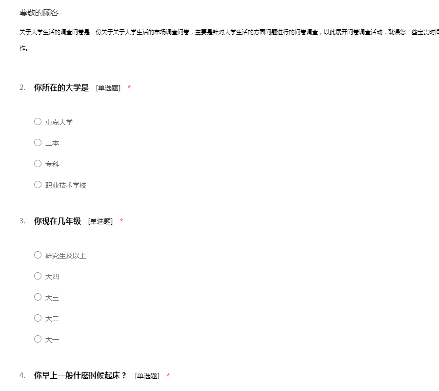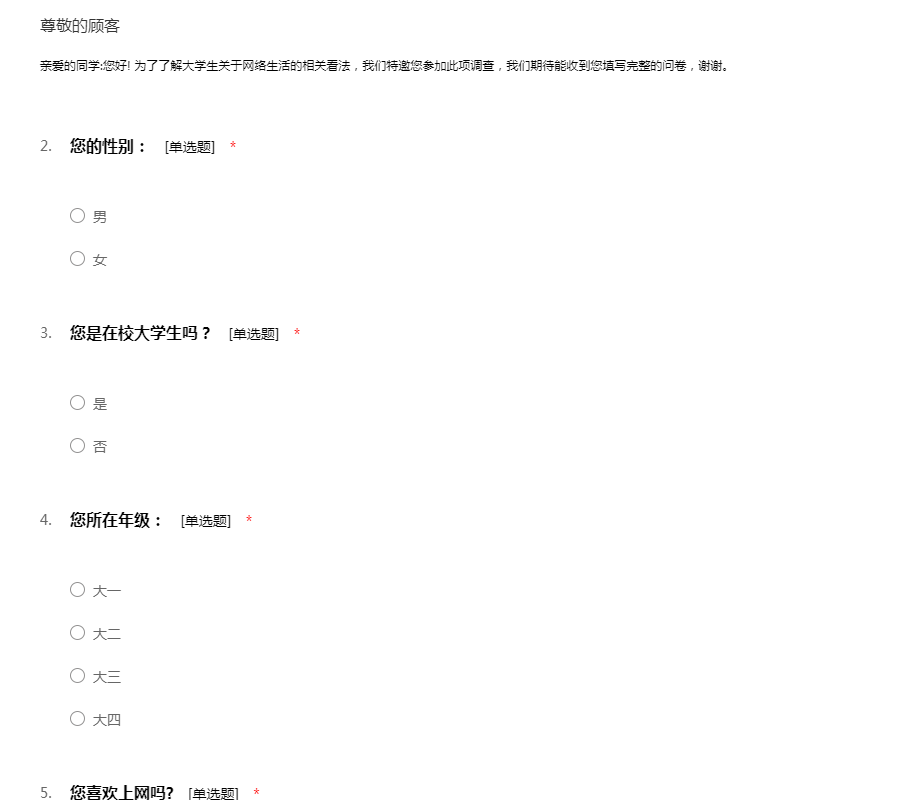 亲爱的同学:您好! 为了了解大学生关于网络生活的相关看法,我们特邀您参加此项调查,我们期待能收到您填写完整的问卷,谢谢。