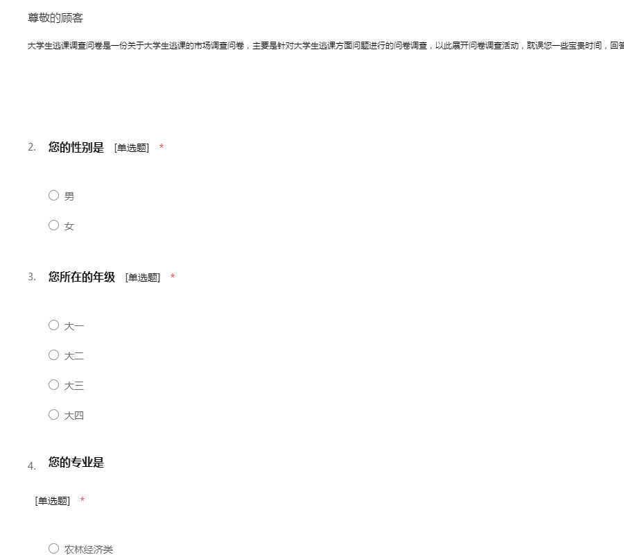 大学生逃课调查问卷是一份关于大学生逃课的市场调查问卷,主要是针对大学生逃课方面问题进行的问卷调查,以此展开问卷调查活动,耽误您一些宝贵时间,回答大学生逃课调查问卷,谢谢您的合作。