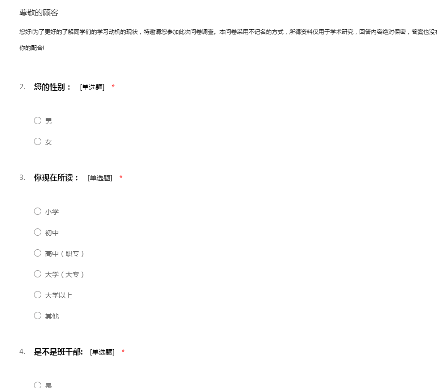 您好!为了更好的了解同学们的学习动机的现状,特邀请您参加此次问卷调查。本问卷采用不记名的方式,所得资料仅用于学术研究,回答内容绝对保密,答案也没有对错之分,所以请不必顾虑,认真作答。谢谢你的配合!