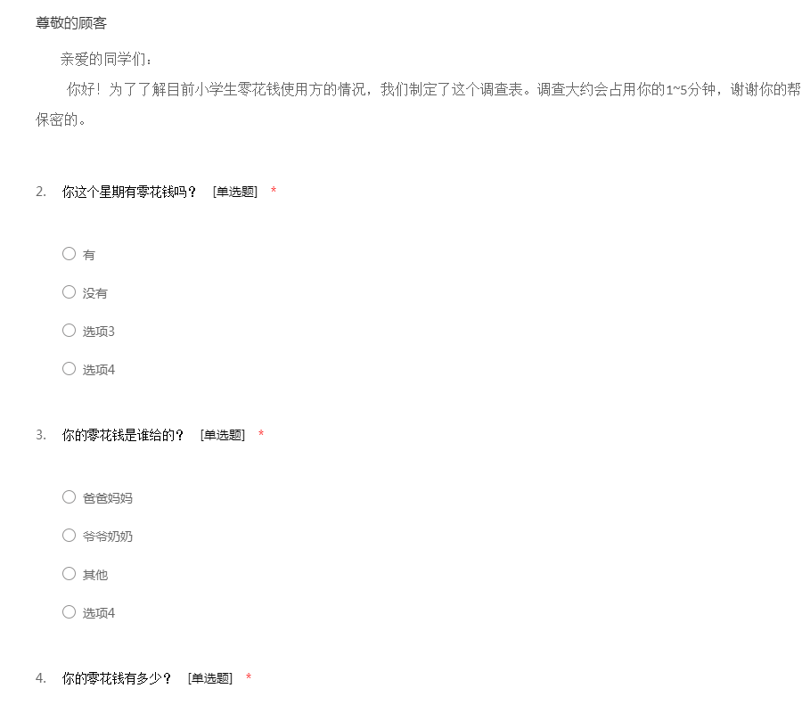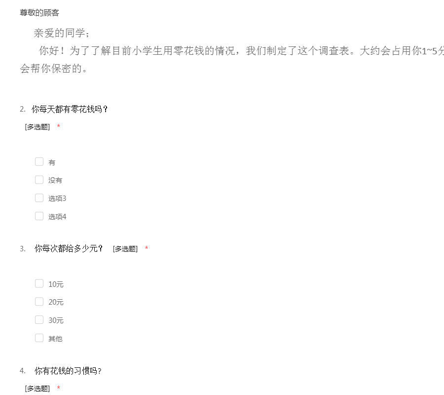 亲爱的同学们: 你好!为了了解目前小学生零花钱使用方的情况,我们制定了这个调查表。调查大约会占用你的1~5分钟,谢谢你的帮助。请你放心,你的答案将是署名和保密的。