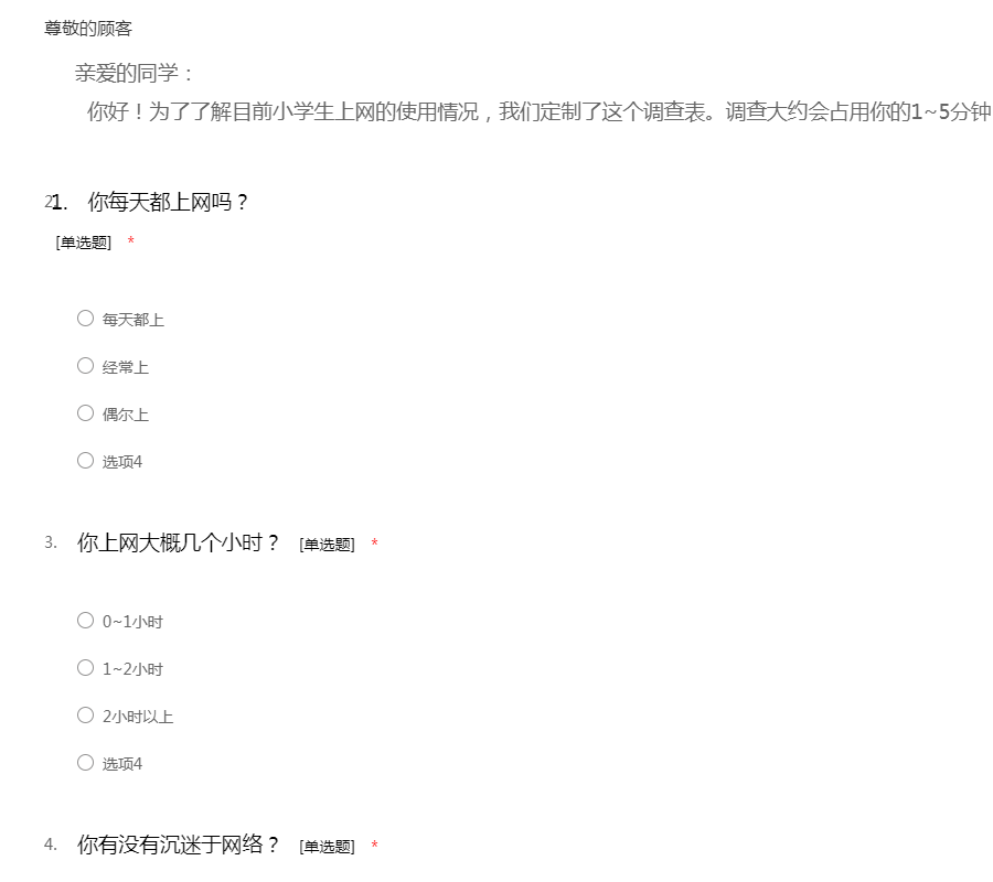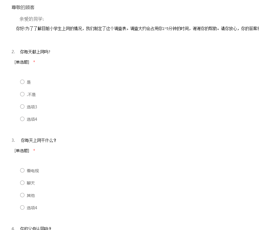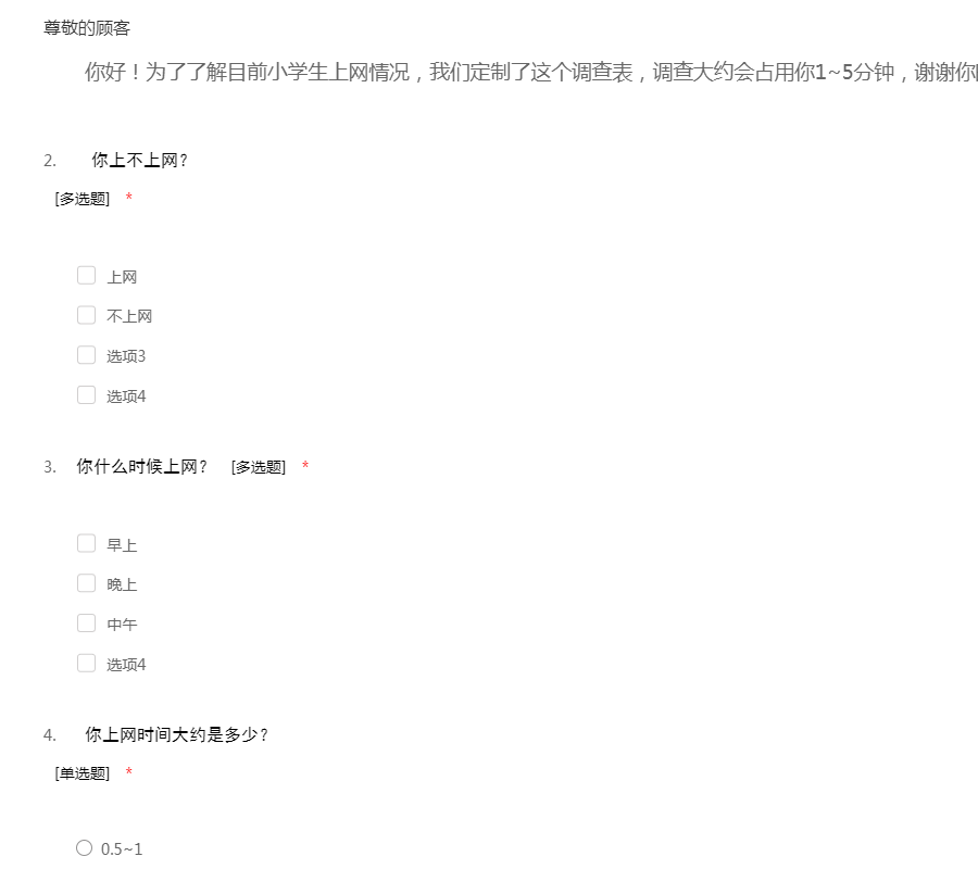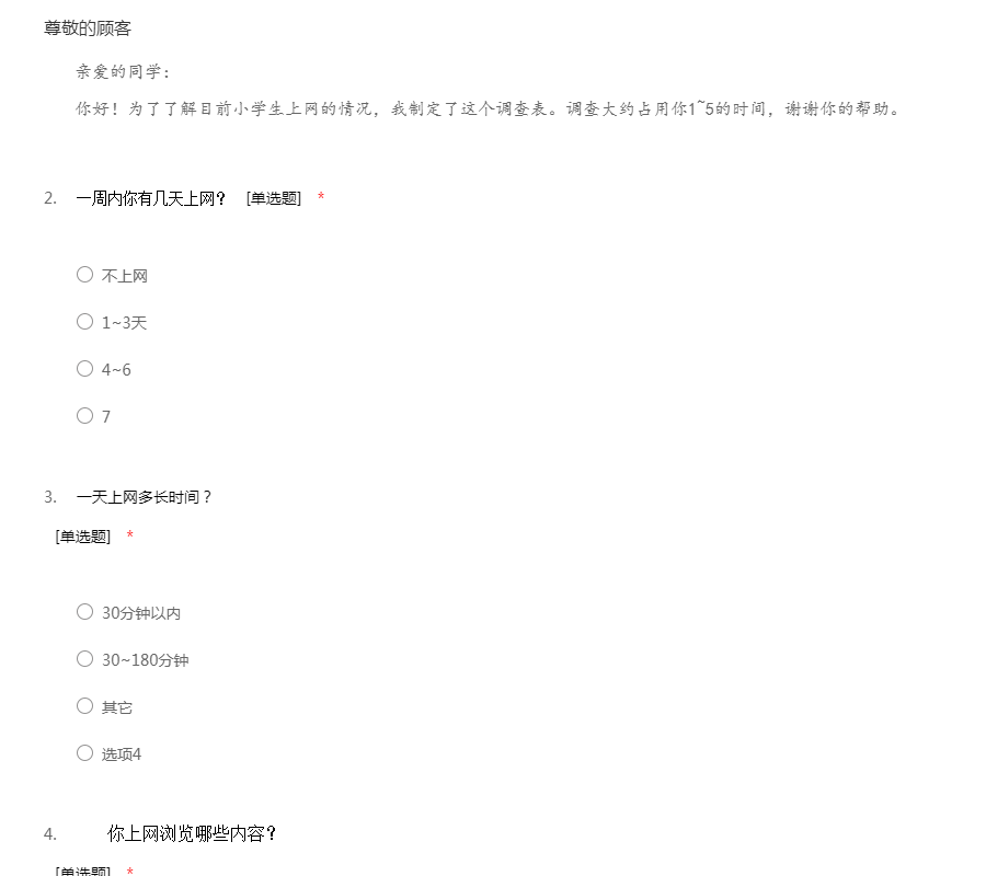 你好!为了了解目前小学生上网情况,我们定制了这个调查表,调查大约会占用你1~5分钟,谢谢你的帮助。