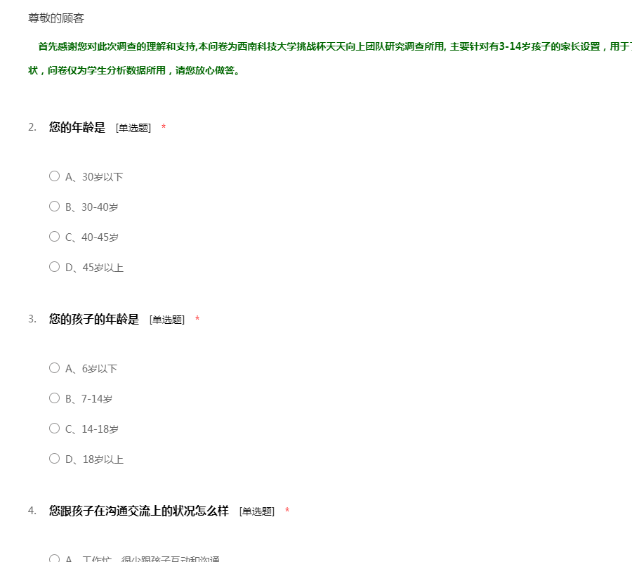 首先感谢您对此次调查的理解和支持,本问卷为西南科技大学挑战杯天天向上团队研究调查所用, 主要针对有3-14岁孩子的家长设置,用于了解当前环境下亲子关系和孩子成长的现状,问卷仅为学生分析数据所用,请您放心做答。