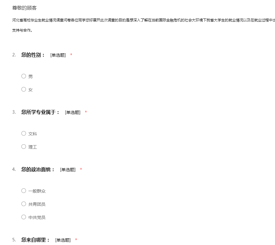 河北省高校毕业生就业情况调查问卷各位同学您好展开此次调查的目的是想深入了解在当前国际金融危机的社会大环境下我省大学生的就业情况以及在就业过程中出现的各种问题和实际困难。感谢您对我们工作的支持与合作。