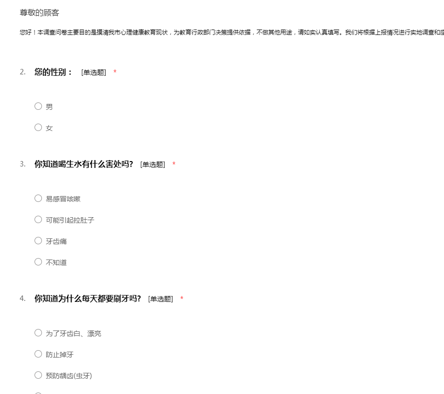 您好!本调查问卷主要目的是摸清我市心理健康教育现状,为教育行政部门决策提供依据,不做其他用途,请如实认真填写。我们将根据上报情况进行实地调查和座谈。谢谢合作!