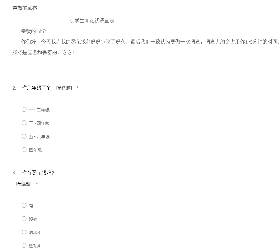小学生零花钱调查表 亲爱的同学: 你们好!今天我为我的零花钱和妈妈争论了好久,最后我们一致认为要做一次调查。调查大约会占用你1~5分钟的时间,谢谢你的帮助。请你放心,你的答案将是匿名和保密的,谢谢!