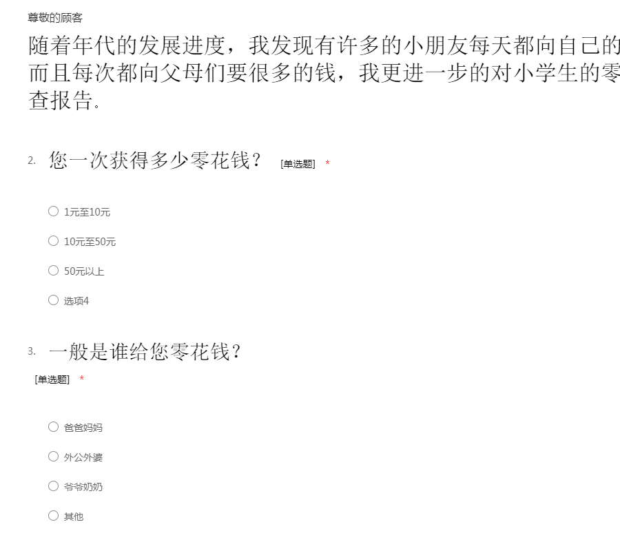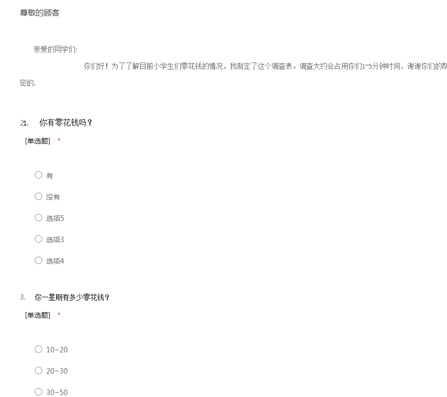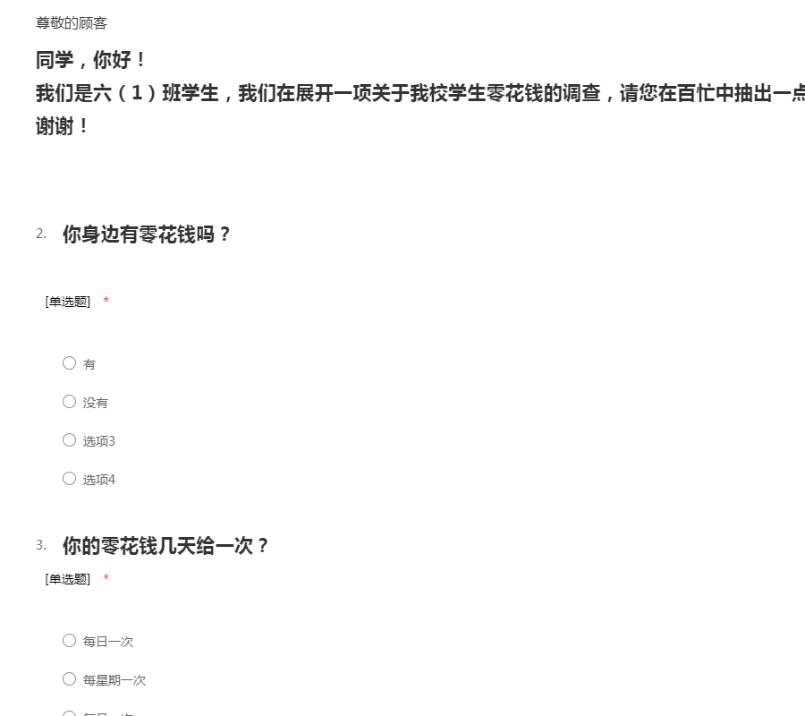 同学,你好! 我们是六(1)班学生,我们在展开一项关于我校学生零花钱的调查,请您在百忙中抽出一点时间,填写这张问卷。 谢谢!