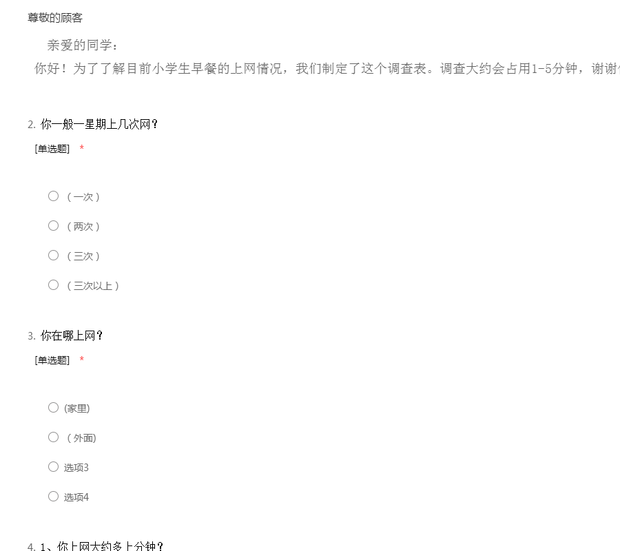 亲爱的同学: 你好!为了了解目前小学生早餐的上网情况,我们制定了这个调查表。调查大约会占用1-5分钟,谢谢你的帮助!