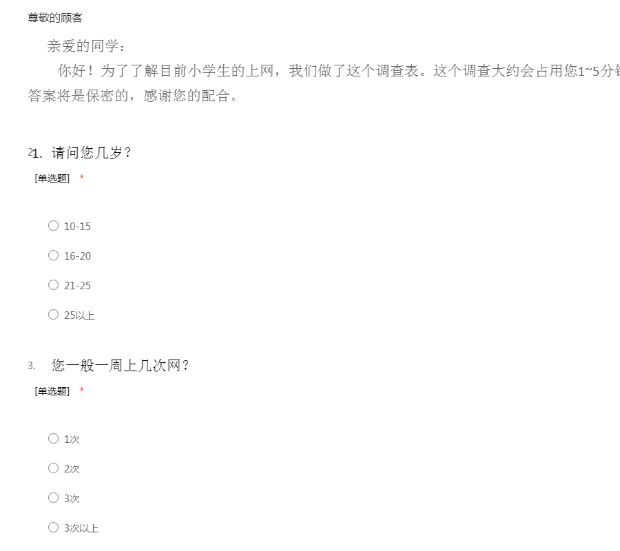 亲爱的同学: 你好!为了了解目前小学生的上网,我们做了这个调查表。这个调查大约会占用您1~5分钟的时间。请您放心,您的答案将是保密的,感谢您的配合。