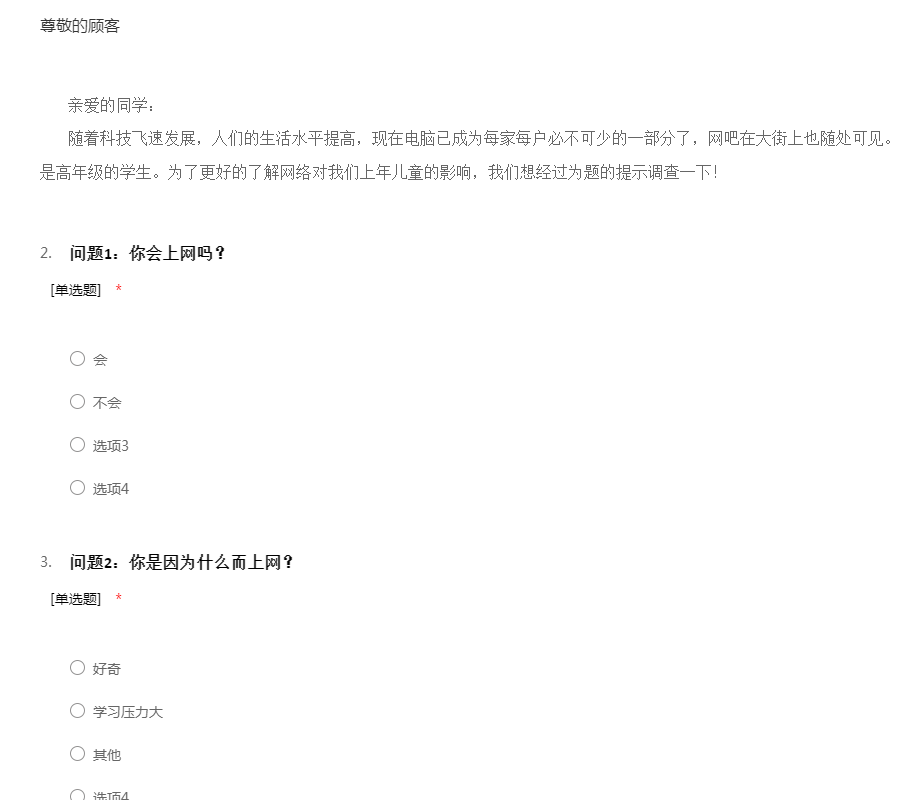亲爱的同学: 随着科技飞速发展,人们的生活水平提高,现在电脑已成为每家每户必不可少的一部分了,网吧在大街上也随处可见。上网已在学生中形成一股热潮,特别是高年级的学生。为了更好的了解网络对我们上年儿童的影响,我们想经过为题的提示调查一下!