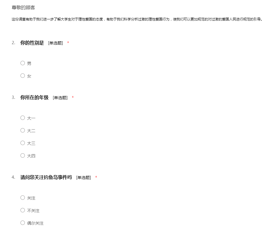 这份调查有助于我们进一步了解大学生对于理性爱国的态度,有助于我们科学分析过激的理性爱国行为,使我们可以更加规范的对过激的爱国人民进行规范的引导。