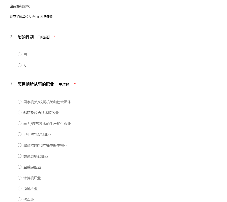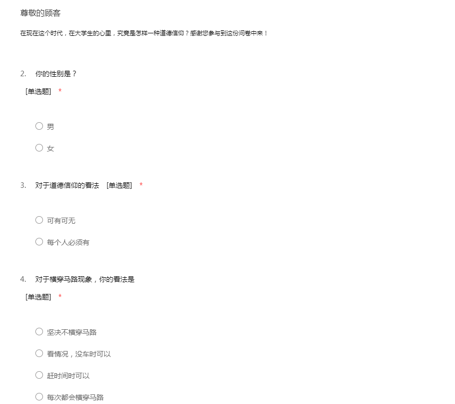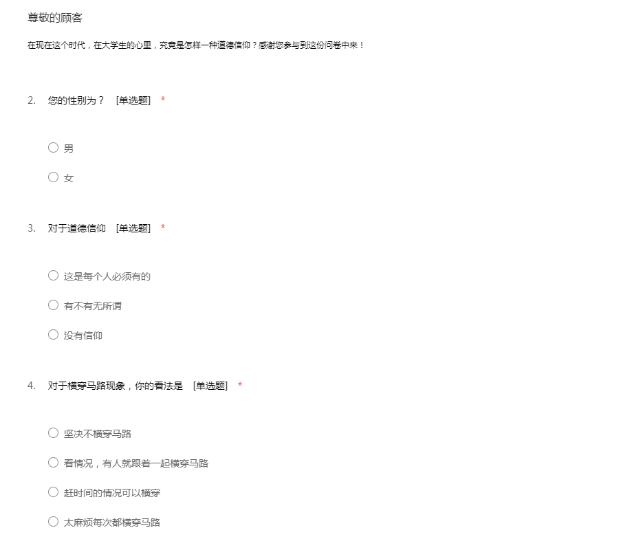 在现在这个时代,在大学生的心里,究竟是怎样一种道德信仰?感谢您参与到这份问卷中来!