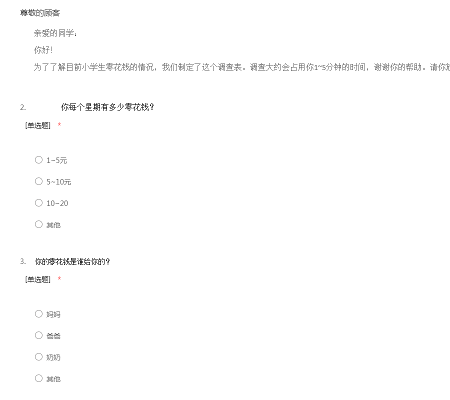 亲爱的同学: 你好! 为了了解目前小学生零花钱的情况,我们制定了这个调查表。调查大约会占用你1~5分钟的时间,谢谢你的帮助。请你放心,你的答案将是保密的。