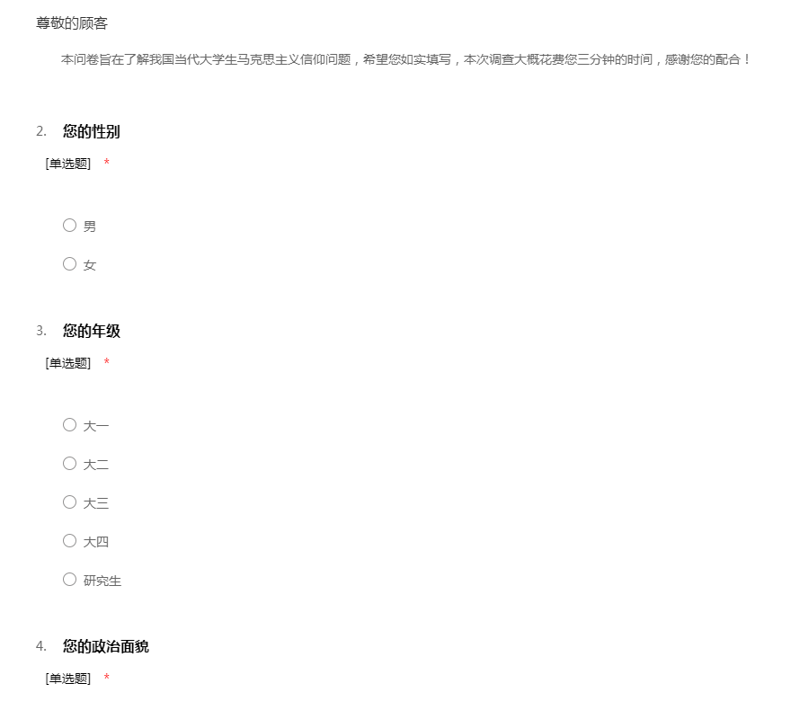 本问卷旨在了解我国当代大学生马克思主义信仰问题,希望您如实填写,本次调查大概花费您三分钟的时间,感谢您的配合!