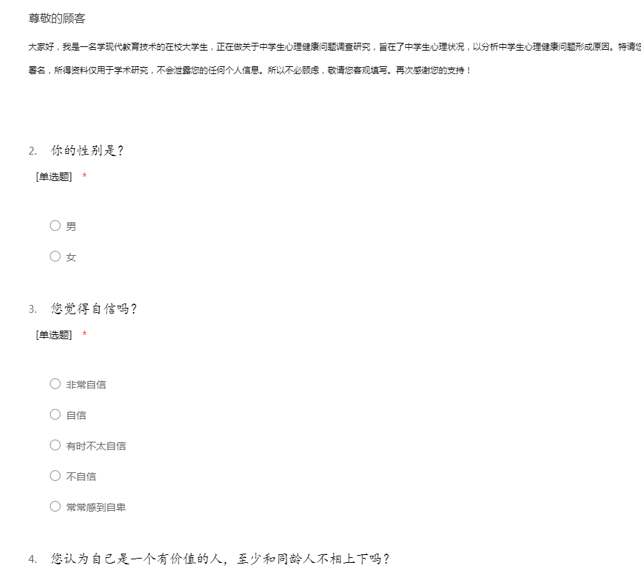 大家好,我是一名学现代教育技术的在校大学生,正在做关于中学生心理健康问题调查研究,旨在了中学生心理状况,以分析中学生心理健康问题形成原因。特请您参加此问卷调查,希望您给予支持。本问卷无需署名,所得资料仅用于学术研究,不会泄露您的任何个人信息。所以不必顾虑,敬请您客观填写。再次感谢您的支持!