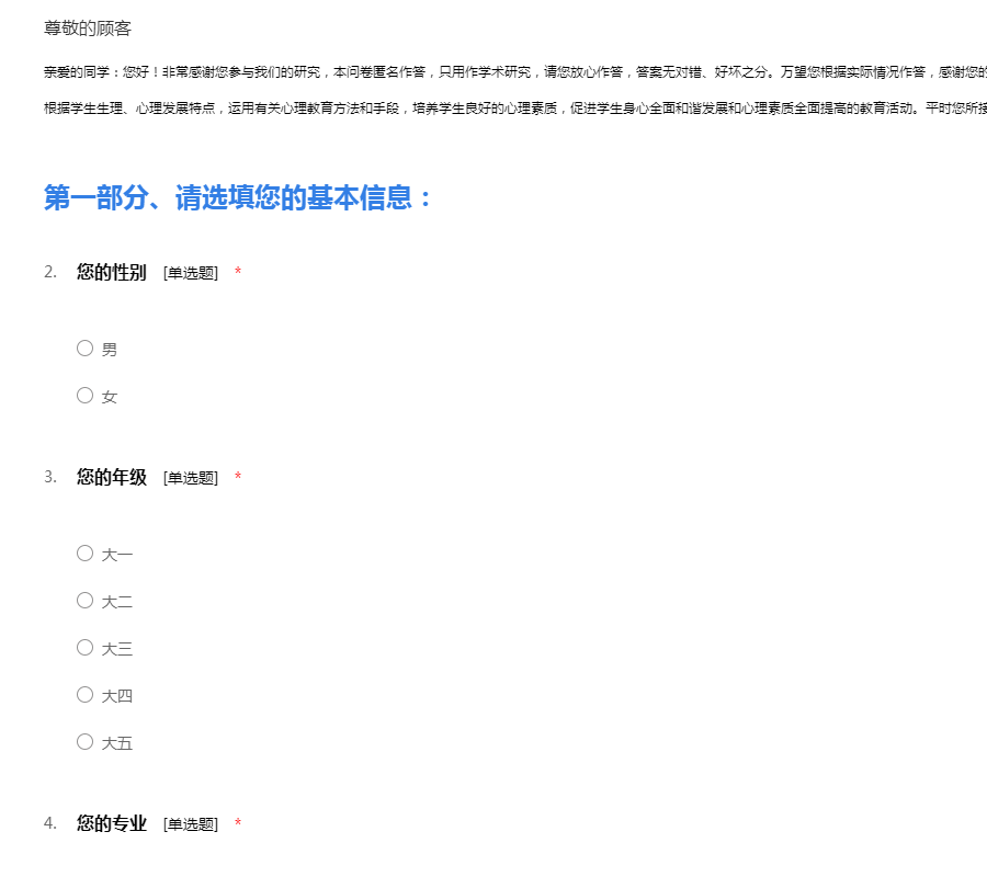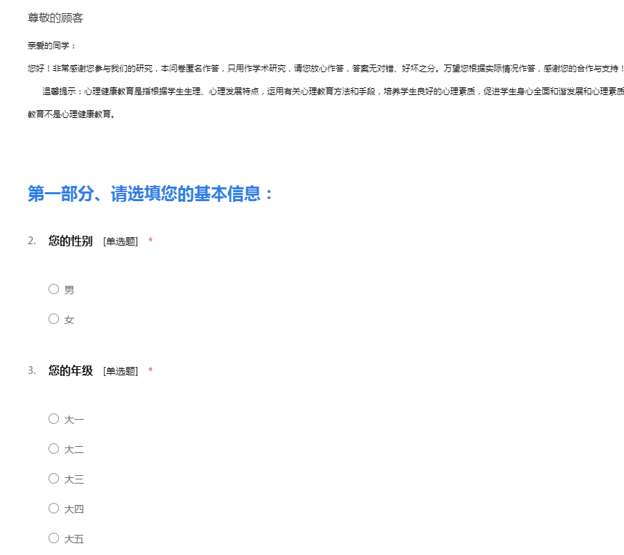 亲爱的同学:您好!非常感谢您参与我们的研究,本问卷匿名作答,只用作学术研究,请您放心作答,答案无对错、好坏之分。万望您根据实际情况作答,感谢您的合作与支持! 温馨提示:心理健康教育是指根据学生生理、心理发展特点,运用有关心理教育方法和手段,培养学生良好的心理素质,促进学生身心全面和谐发展和心理素质全面提高的教育活动。平时您所接触的思想品德教育不是心理健康教育。