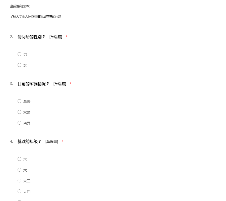 亲爱的同学:你好!为了更好地了解大家的恋爱观及恋爱状况,为大家现在或以后可能遇到的问题提供帮助,我们特设计此问卷。问卷所用数据均用于统计分析且为匿名调查,我们会保护你的隐私权,望如实回答。非常感谢你的支持。