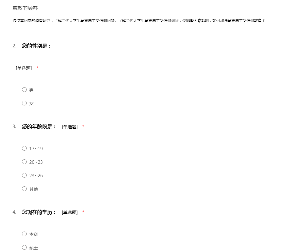 通过本问卷的调查研究,了解当代大学生马克思主义信仰问题。了解当代大学生马克思主义信仰现状,受哪些因素影响,如何加强马克思主义信仰教育?