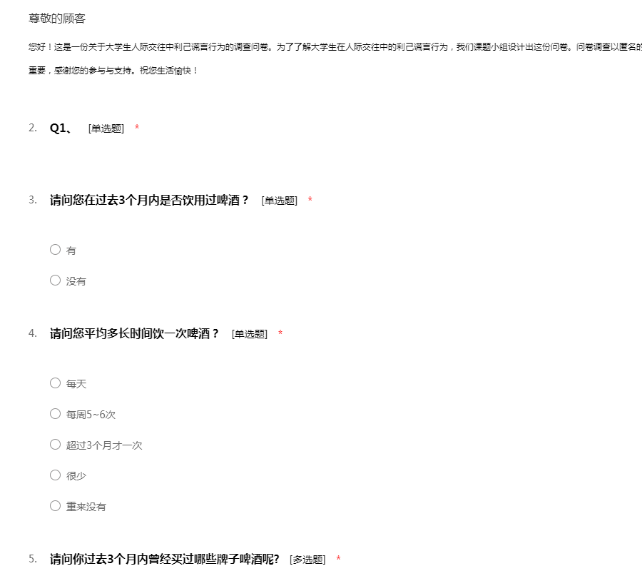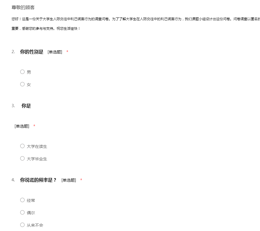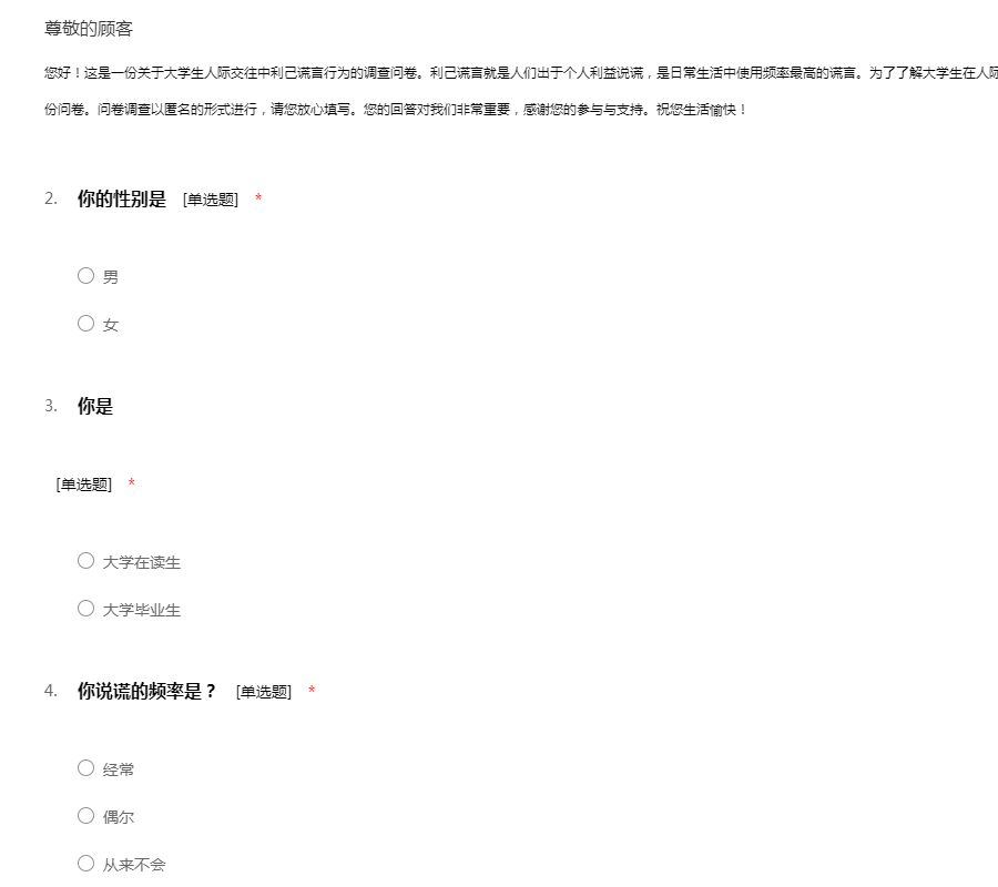 您好!这是一份关于大学生人际交往中利己谎言行为的调查问卷。利己谎言就是人们出于个人利益说谎,是日常生活中使用频率最高的谎言。为了了解大学生在人际交往中的利己谎言行为,我们课题小组设计出这份问卷。问卷调查以匿名的形式进行,请您放心填写。您的回答对我们非常重要,感谢您的参与与支持。祝您生活愉快!