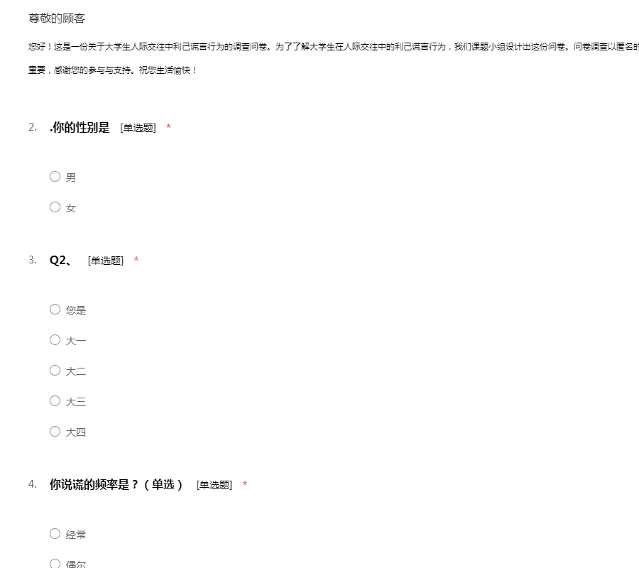 您好!这是一份关于大学生人际交往中利己谎言行为的调查问卷。为了了解大学生在人际交往中的利己谎言行为,我们课题小组设计出这份问卷。问卷调查以匿名的形式进行,请您放心填写。您的回答对我们非常重要,感谢您的参与与支持。祝您生活愉快!