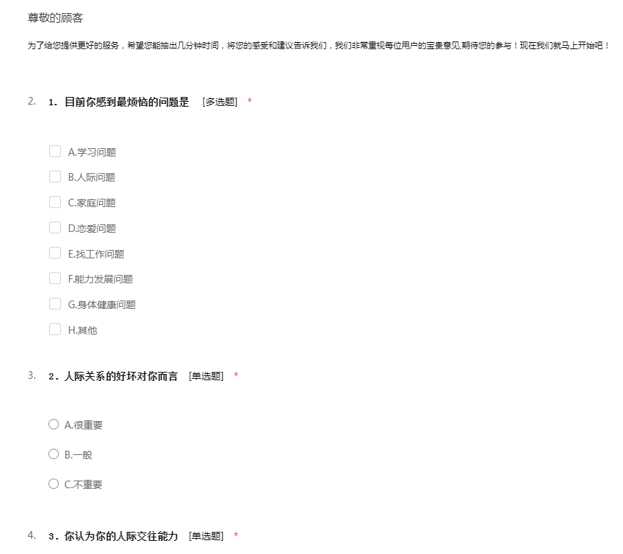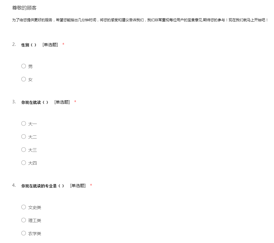 为了给您提供更好的服务,希望您能抽出几分钟时间,将您的感受和建议告诉我们,我们非常重视每位用户的宝贵意见,期待您的参与!现在我们就马上开始吧!