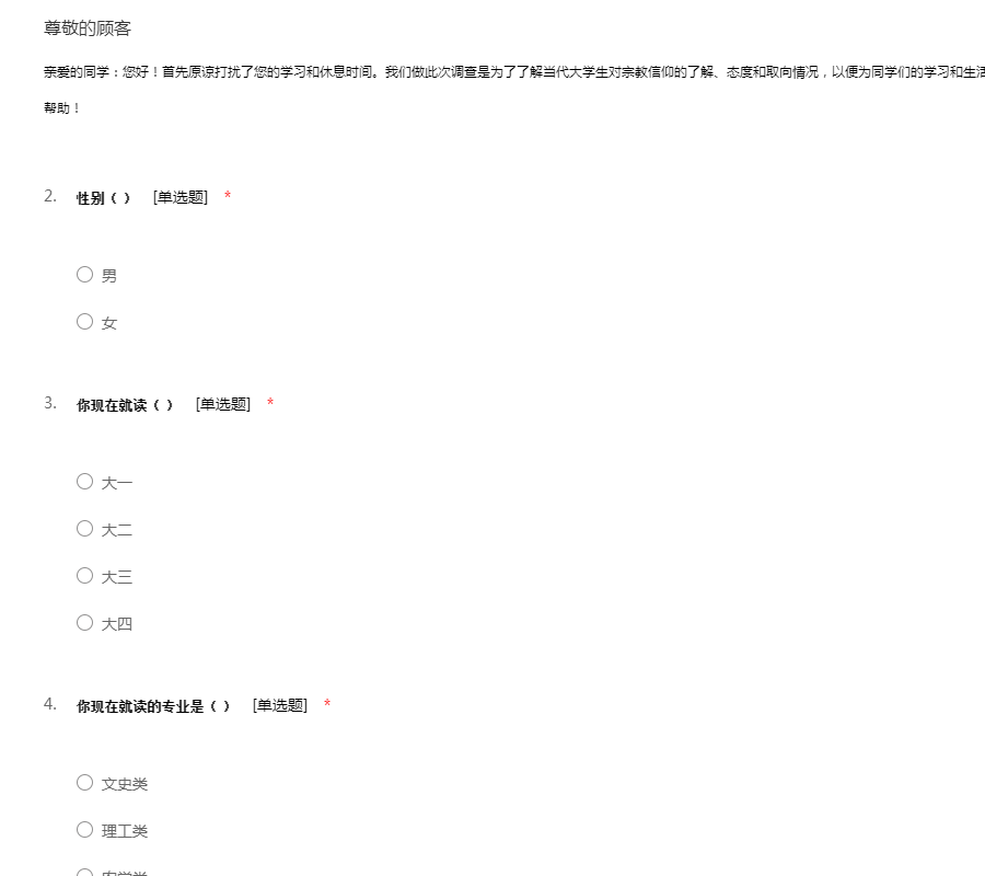亲爱的同学:您好!首先原谅打扰了您的学习和休息时间。我们做此次调查是为了了解当代大学生对宗教信仰的了解、态度和取向情况,以便为同学们的学习和生活提供积极的引导意义,能够希望得到您的支持和帮助!
