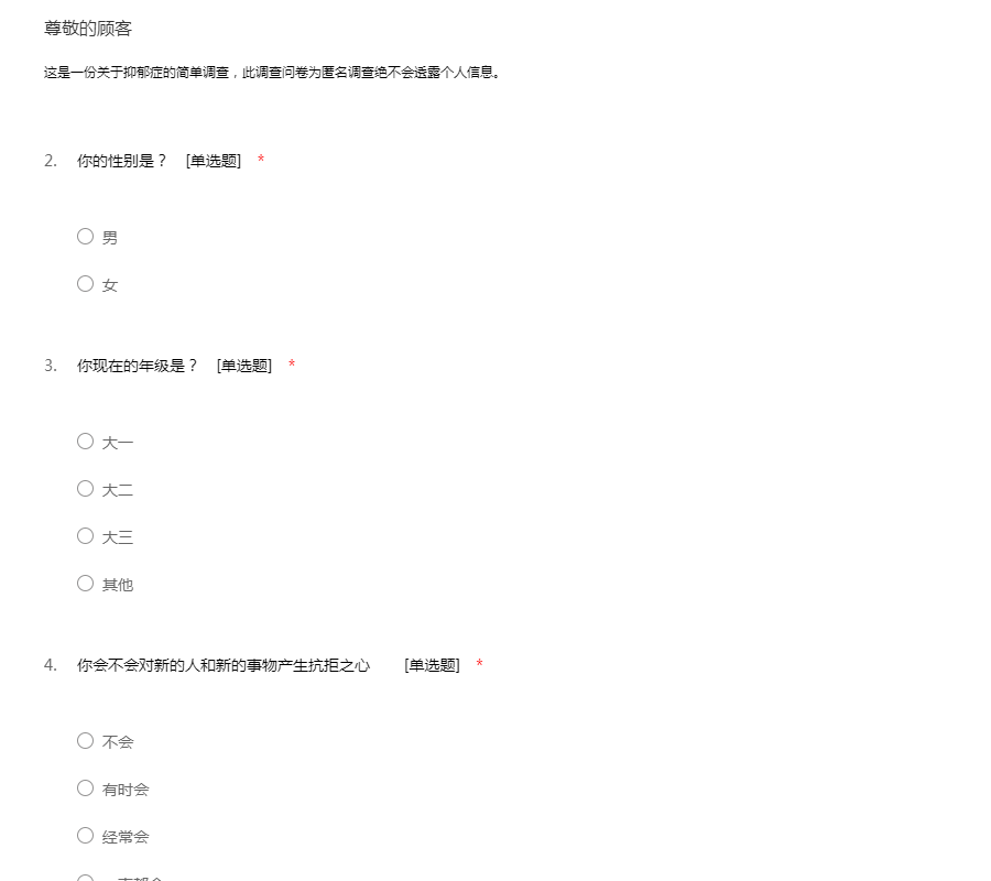 这是一份关于抑郁症的简单调查,此调查问卷为匿名调查绝不会透露个人信息。