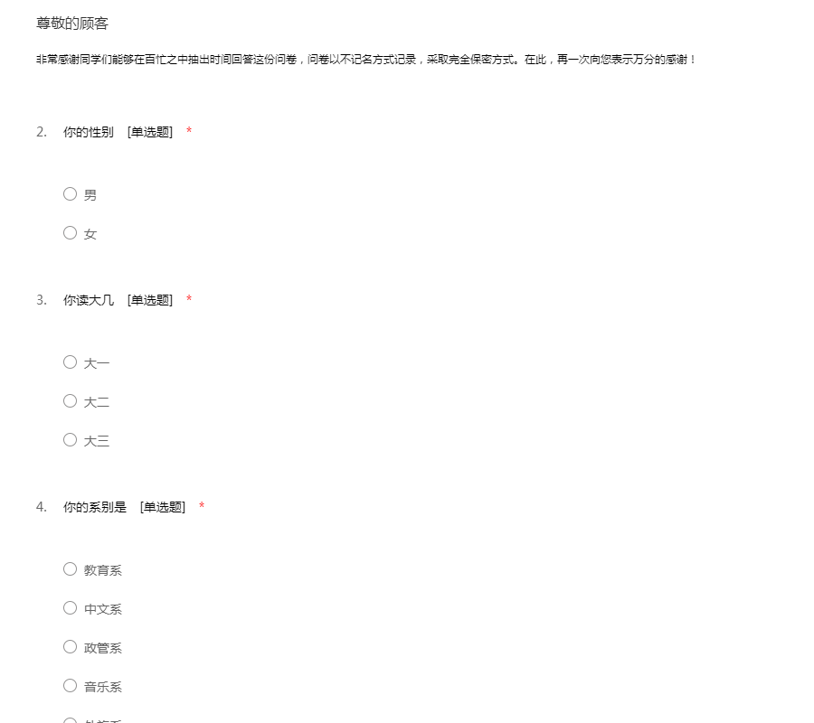 亲爱的同学:你好!为了更好地了解大家的恋爱观及恋爱状况,为大家现在或以后可能遇到的问题提供帮助,我们特设计此问卷。问卷所用数据均用于统计分析且为匿名调查,我们会保护你的隐私权,望如实回答。非常感谢你的支持。