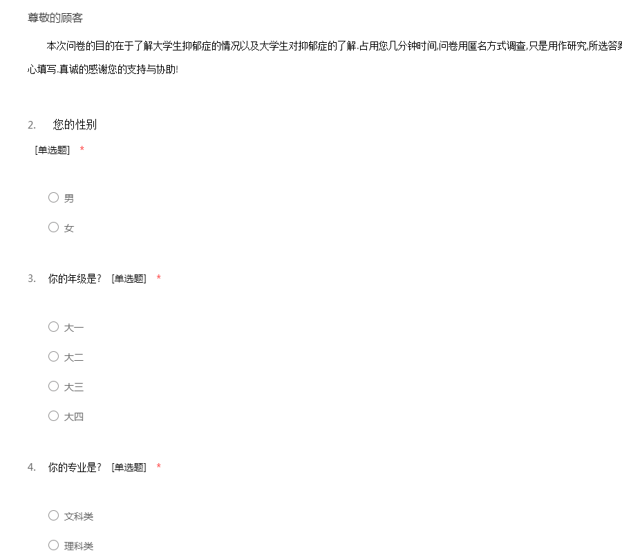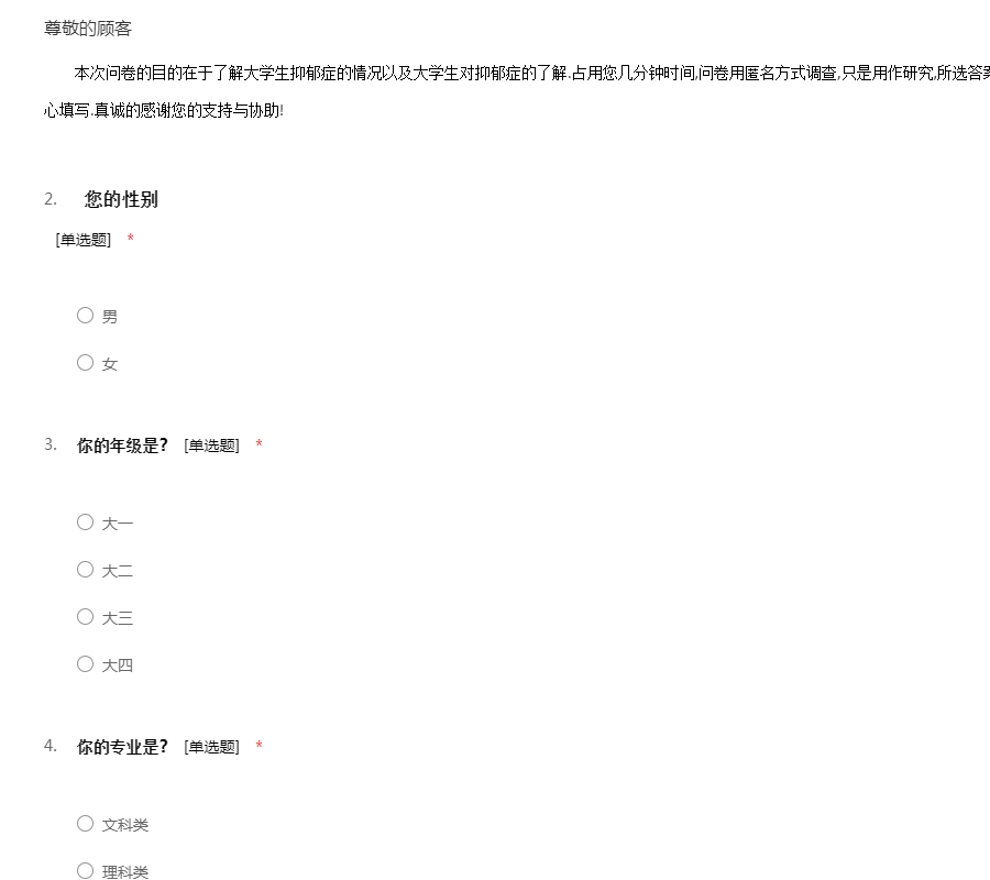 本次问卷的目的在于了解大学生抑郁症的情况以及大学生对抑郁症的了解.占用您几分钟时间,问卷用匿名方式调查,只是用作研究,所选答案对调查者不会造成任何不利的影响,请放心填写.真诚的感谢您的支持与协助!