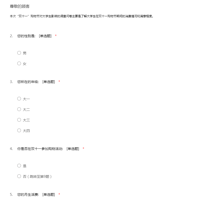 您好!我们现在在做一份关于大学生消费情况的问卷调查,消费是我们每天都要经历的事。大学生有了一定的经济来源,能够自由消费。所以如何合理消费成了我们去探讨的问题,希望能占用你们几分钟的时间,认真填完这份问卷,我们将感谢您的配合
