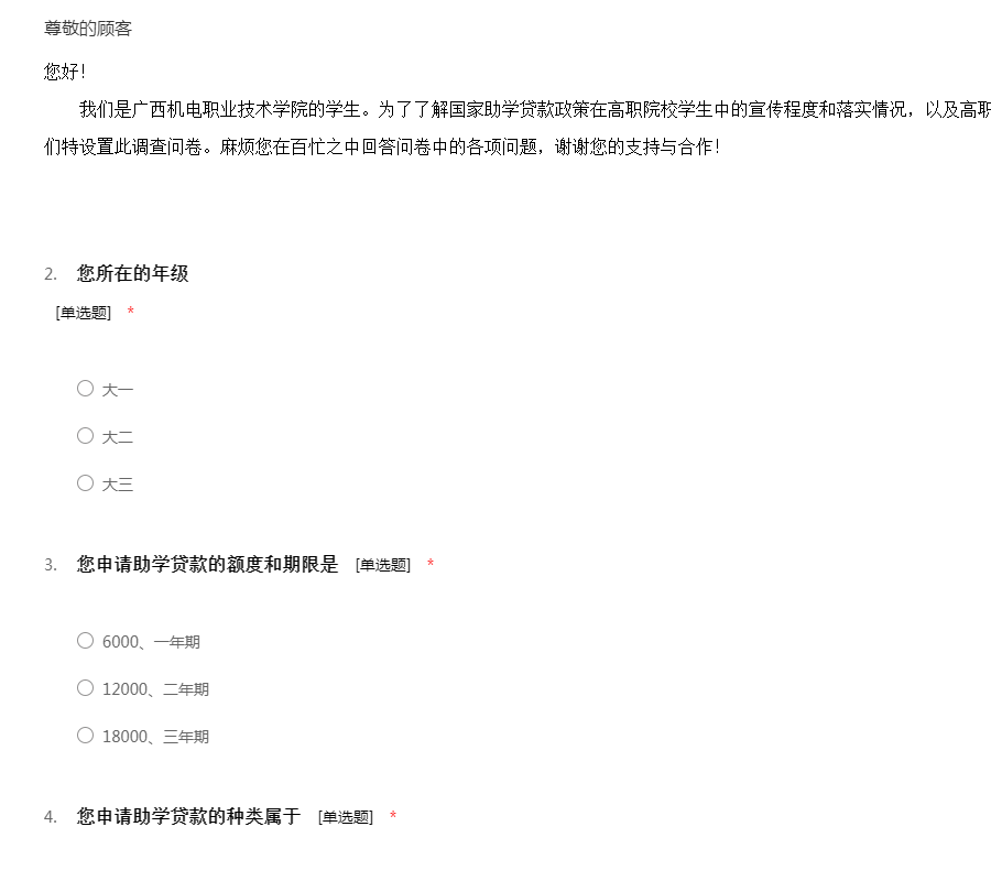 您好! 我们是广西机电职业技术学院的学生。为了了解国家助学贷款政策在高职院校学生中的宣传程度和落实情况,以及高职生对助学贷款的信用意识现状,我们特设置此调查问卷。麻烦您在百忙之中回答问卷中的各项问题,谢谢您的支持与合作!