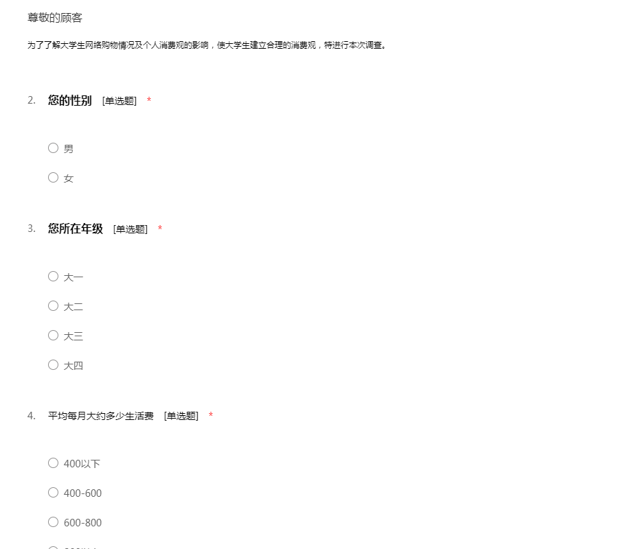 此份问卷是为了调查一下在大学生的消费观,希望您能认真填写问卷,谢谢您的合作!51调查网(我要调查网)谢谢您的参与。