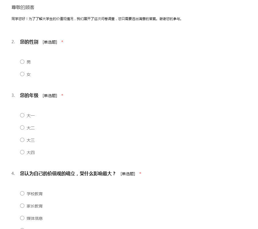 同学您好!为了了解大学生的价值观情况,我们展开了这次问卷调查,您只需要选出满意的答案。谢谢您的参与。