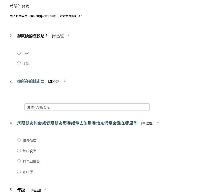 此份问卷是为了调查一下在各大高校学子的消费行为,希望您能认真填写问卷,谢谢您的合作!51调查网(我要调查网)谢谢您的参与。