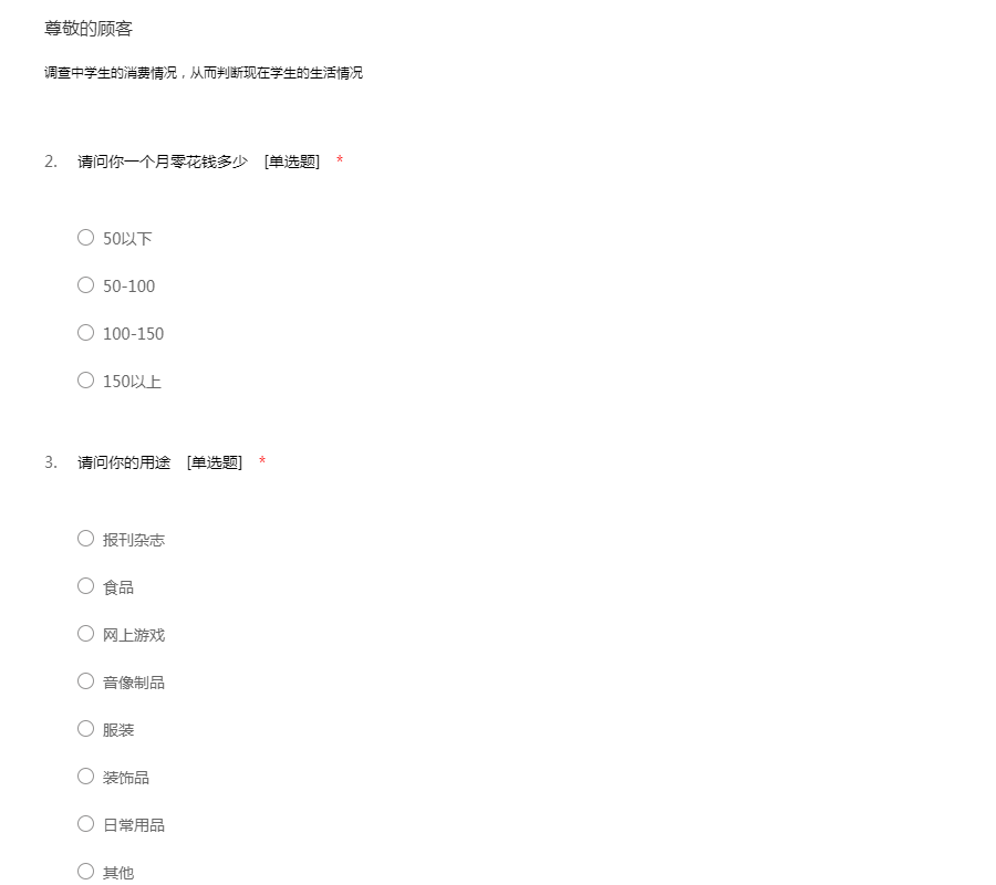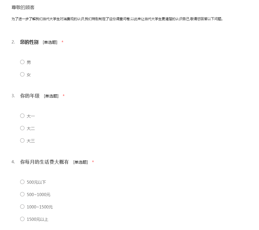 为了进一步了解我们当代大学生对消费观的认识,特别制定了这份调查问卷,以此来让当代大学生更清楚的认识自己,敬请您回答以下问题。23333