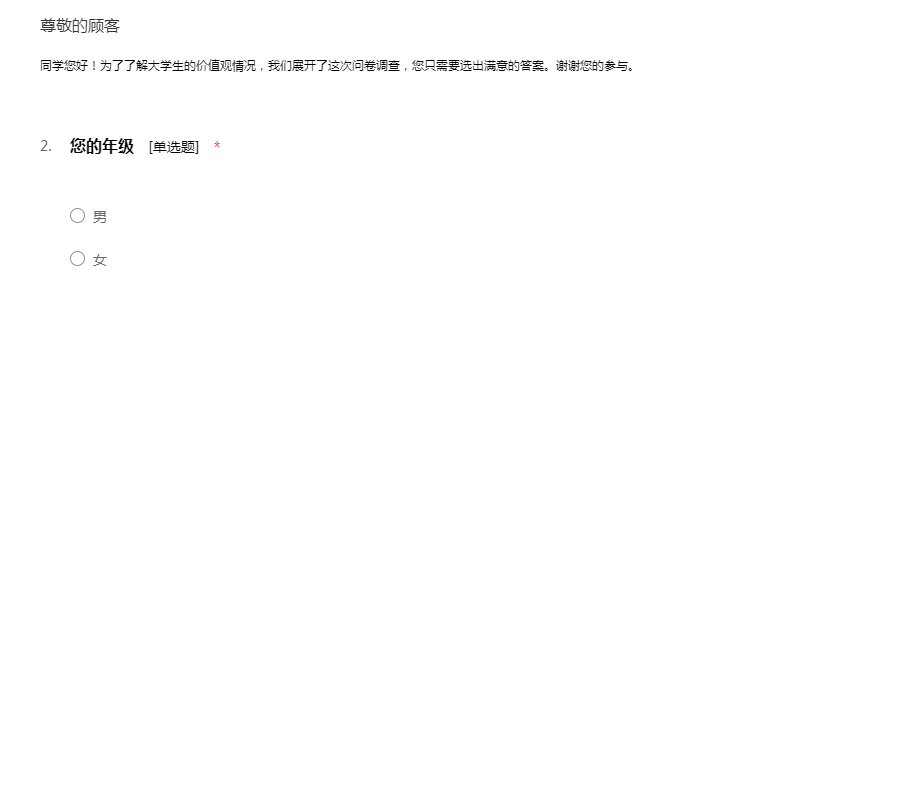 同学您好!为了了解大学生的价值观情况,我们展开了这次问卷调查,您只需要选出满意的答案。谢谢您的参与。