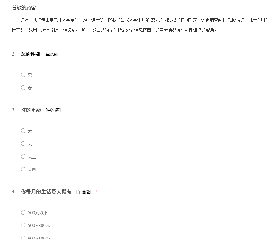 您好,我们是山东农业大学学生,为了进一步了解我们当代大学生对消费观的认识,我们特别制定了这份调查问卷,想邀请您用几分钟时间帮忙填答这份问卷。本问卷实行匿名制,所有数据只用于统计分析, 请您放心填写。题目选项无对错之分,请您按自己的实际情况填写。谢谢您的帮助。