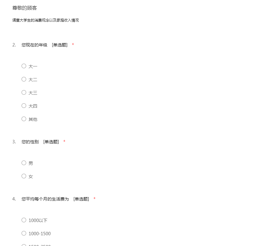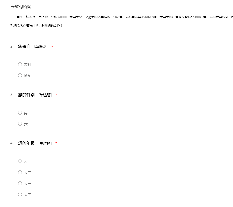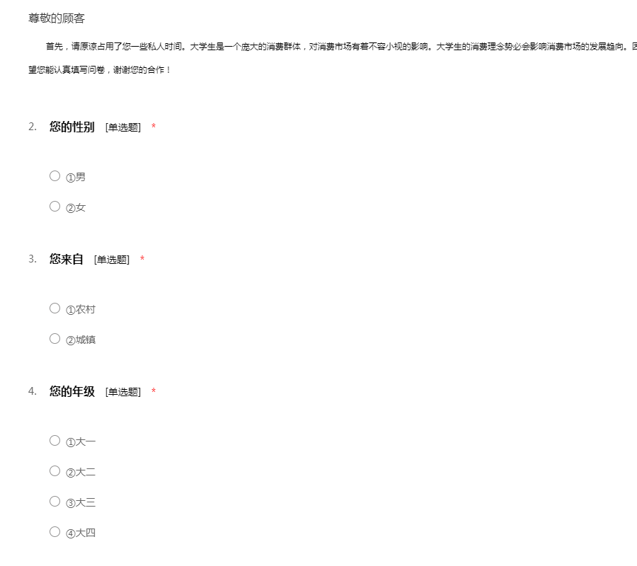 首先,请原谅占用了您一些私人时间。大学生是一个庞大的消费群体,对消费市场有着不容小视的影响。大学生的消费理念势必会影响消费市场的发展趋向。因此,我们希望就大学生的消费情况进行调查。希望您能认真填写问卷,谢谢您的合作!
