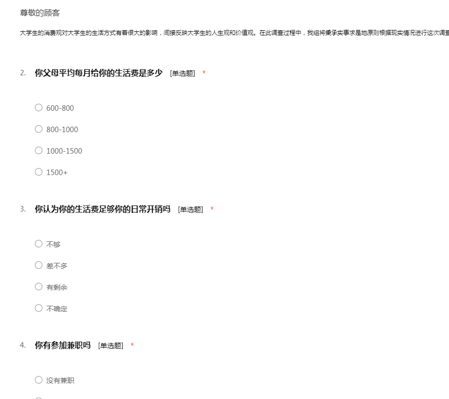 为了进一步了解我们当代大学生对消费观的认识(其实是思修作业),我们选择了这份调查问卷,拜托各位配合填一下~
