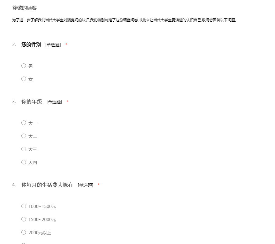 为了进一步了解我们当代大学生对消费观的认识,我们特别制定了这份调查问卷,以此来让当代大学生更清楚的认识自己,敬请您回答以下问题。
