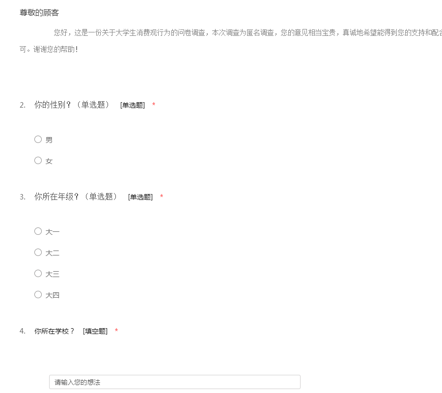 您好,这是一份关于大学生消费观行为的问卷调查,本次调查为匿名调查,您的意见相当宝贵,真诚地希望能得到您的支持和配合,您只需根据自己的实际情况填写即可。谢谢您的帮助!